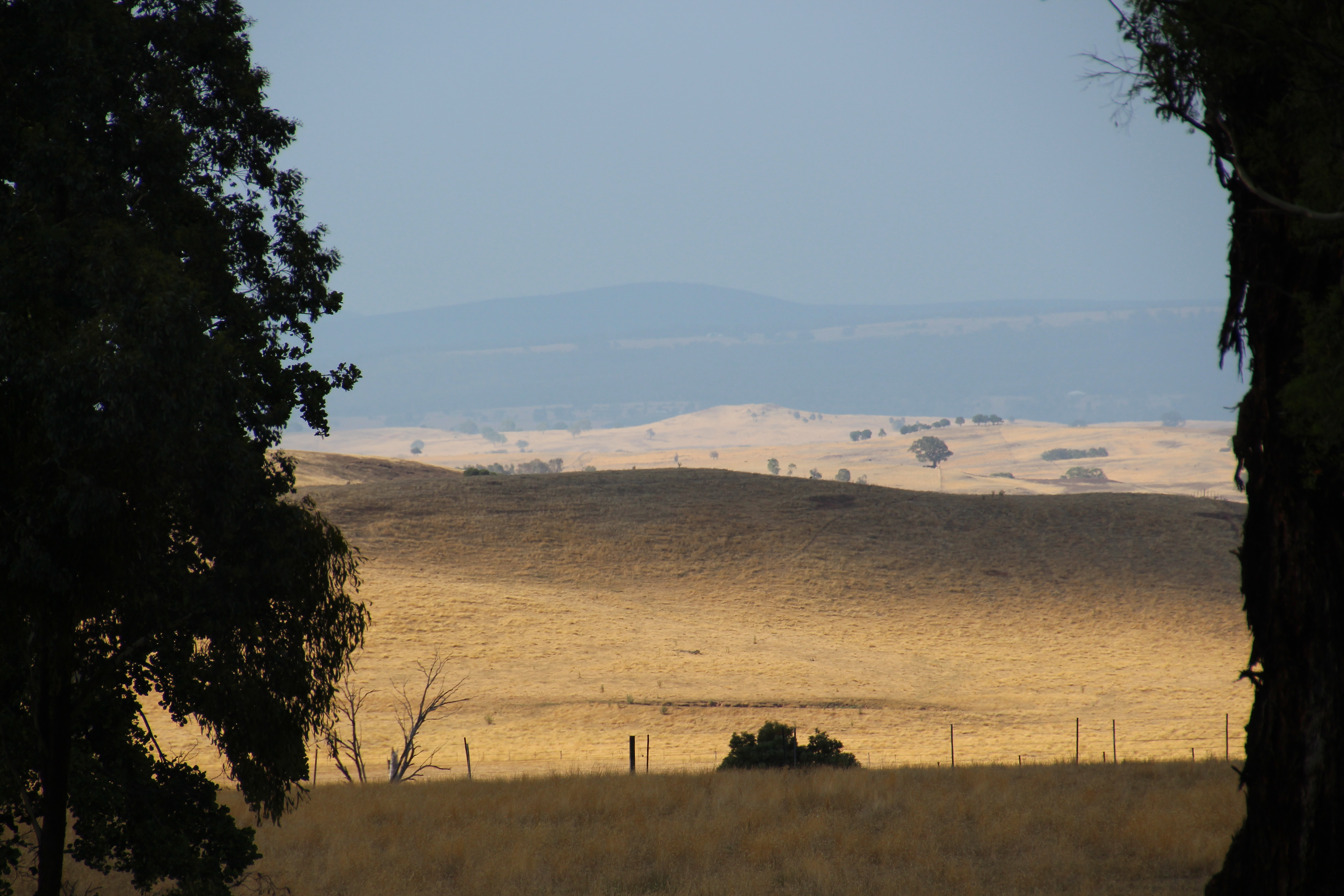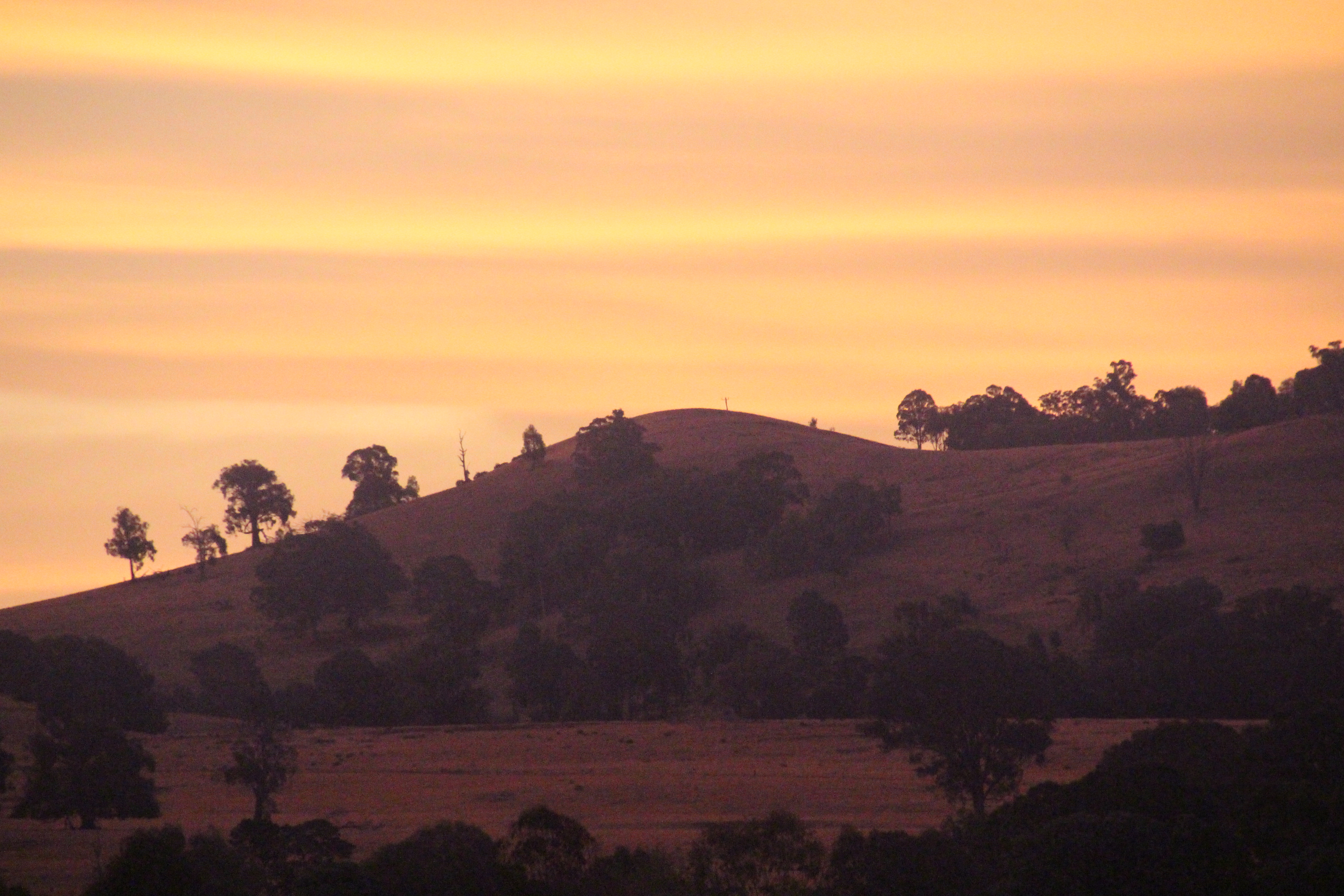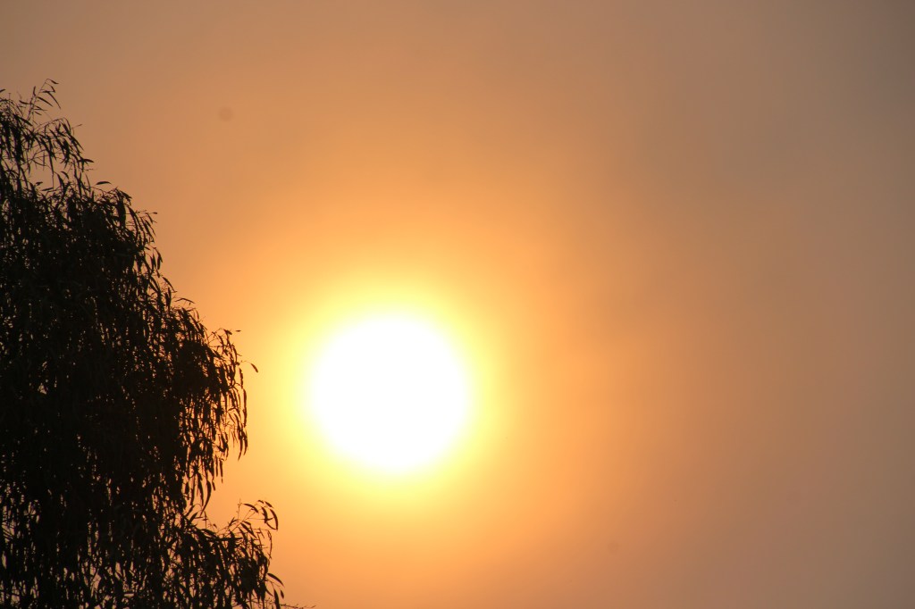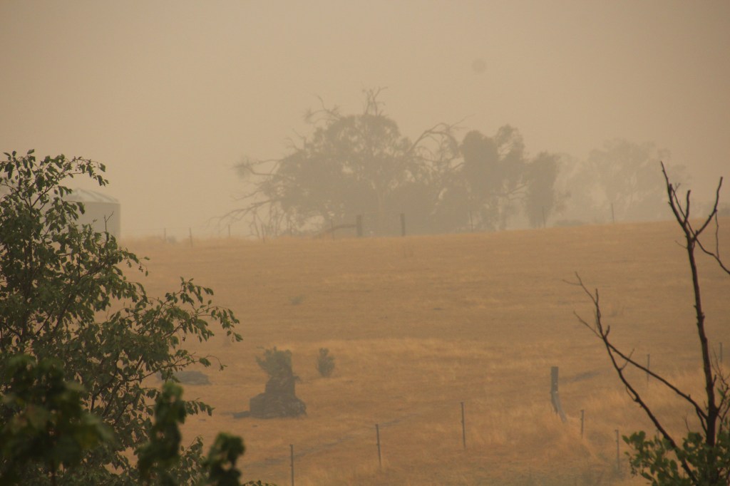 Sunset through the smoke hazeNearby hills are obscured by thick smoke haze